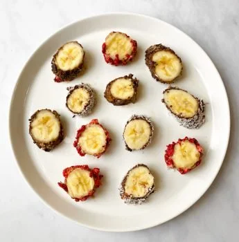 Coat one banana in melted dark chocolate, then coat in the coconut. Coat the second banana in almond butter, then roll it in the chopped dark chocolate. Coat the final banana in tahini, then top with freeze-dried strawberries.